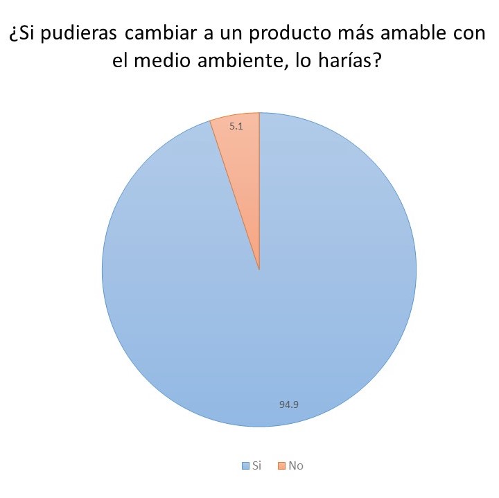 En esta última gráfica se ve reflejado que casi el 100% de las mujeres cambiarían a una alternativa más amigable con el medio ambiente, esto quiere decir que si son conscientes de la asombrosa cantidad de desechos que generan mes con mes, pero a pesar de ello siguen prefiriendo la comodidad y dinamismo de los productos desechables sobre aquellos productos que ofrecen tanto una larga vida útil como una mejor salud vaginal.