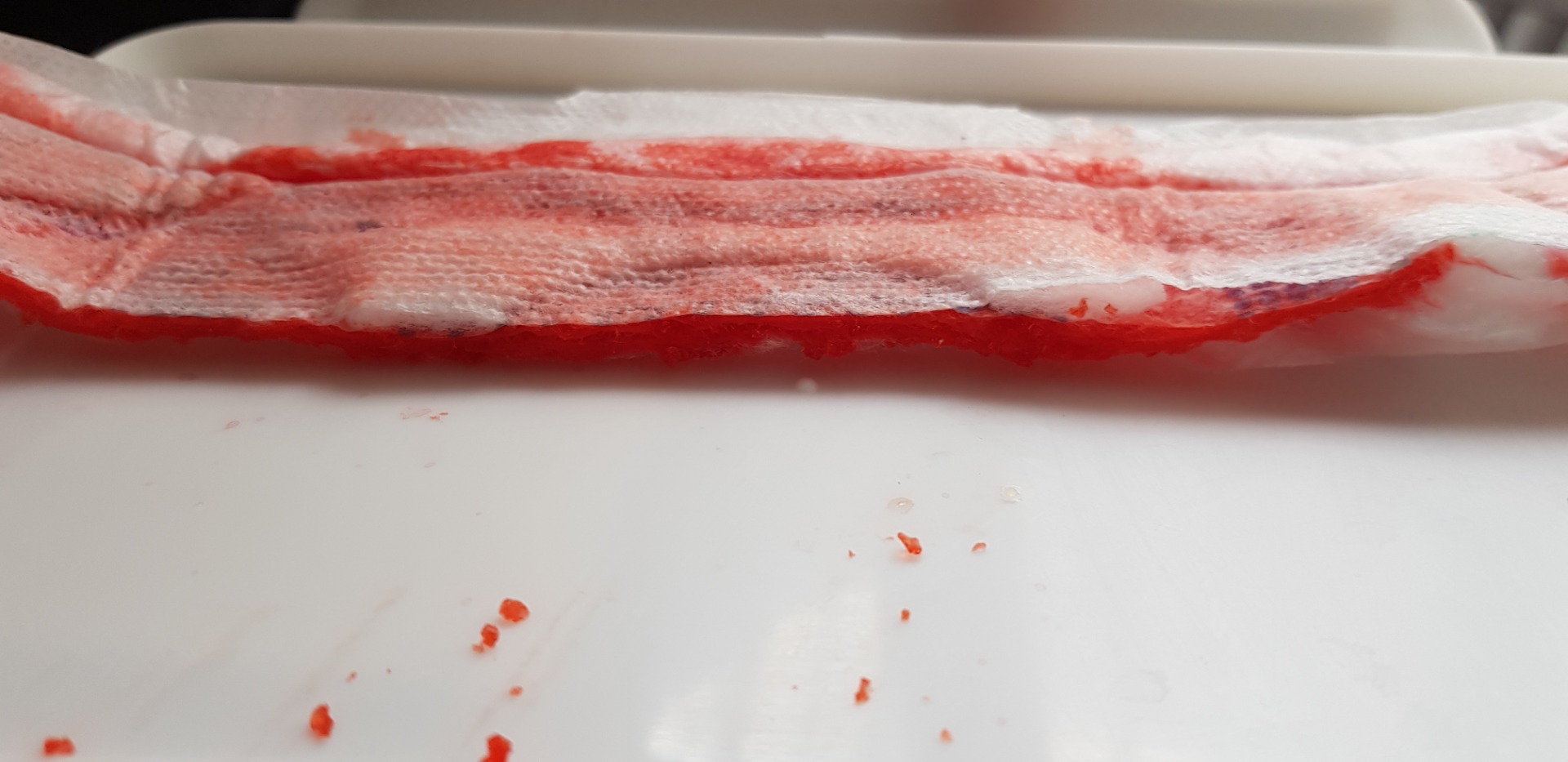 Otro hallazgo interesante que obtuvimos al poner a prueba el nivel de absorción fue la aparición del gel absorbente que a simple vista en la autopsia no se distinguía, sino que fue hasta que las toallas se encontraban húmedas que se comenzaron a formar partículas cristalinas conteniendo la humedad.